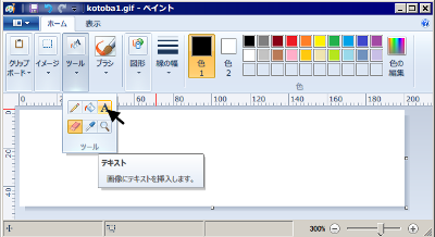さてダウンロードし解凍したファイルにのなかのひとつ、kotoba1.gifを別の場所にコピーしておきましょう。こうしておけばもし作業に失敗しても元に戻すことができます。このようにパソコンの作業をするときは予期しない不都合な出来事にも予め備えておく用心深さが大切ですね。いつも思い通りにいくわけではありませんから。 さてkotoba1.gifを開きます。kotoba1.gifのアイコンをダブルクリックすると別のソフトが起動することもあります。その場合はペイントを起動してからkotoba1.gifを開いてください。すると一番上の図のように表示されます。