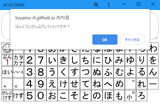 つまり「けす」と「ぜんぶけす」が隣り合っているのがよろしくないようです。そこで、「けす」を左下に残し、「ぜんぶけす」だけひらがな文字盤の右下角に変更してみました。